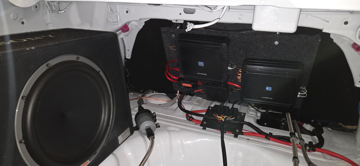 This is fed by an Alpine Mono Block Amplifier. Provides a good quality sound that's loud enough to drown out the boot mounted Bosch fuel pumps.